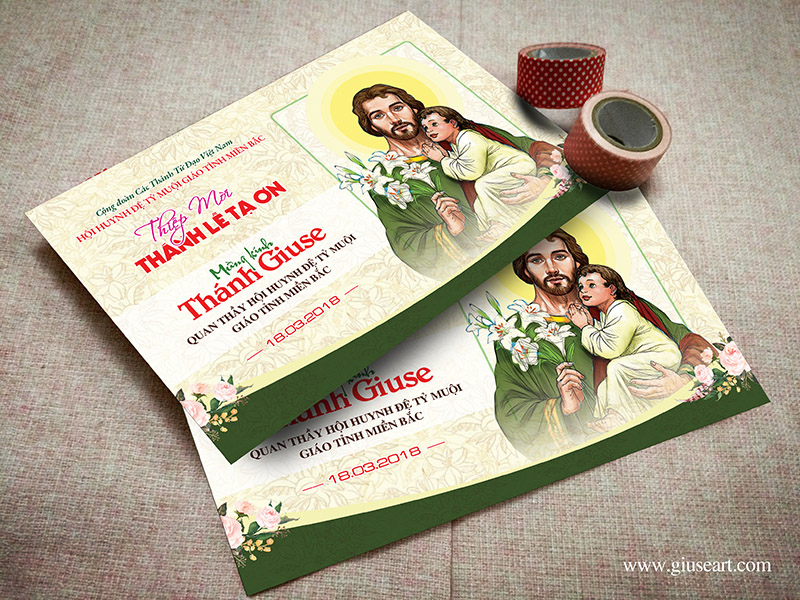 Hội huynh đệ tỷ muội Giáo tỉnh Miền Bắc thuộc Cộng đoàn Các Thánh Tử Đạo Việt Nam tại Taiwan (Đài Loan). Hội này nhận Thánh cả Giuse làm Quan thầy. Trong dịp lễ sắp tới các anh chị có tổ chức Thánh lễ và tiệc mừng nên cần in thiệp để gửi tới các khách mời. Rất vinh dự cho mình khi nhận được lời đề nghị của các anh chị. Dựa trên những thông tin nhận được, mình đã thiết kế thiệp mời như sau: